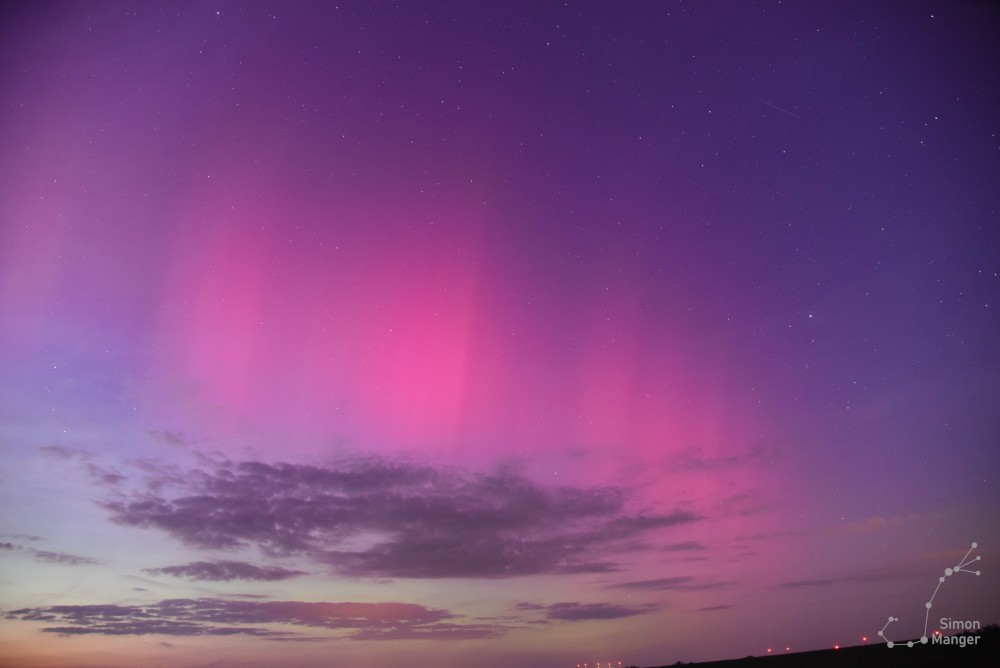Gegen 04:00 Uhr morgens begann ich damit, die letzten Aufnahmen zu machen. Noch immer war der Sonnensturm voll im Gange, sodass der Himmel mit Polarlichtern erfüllt war. Zwischen Binsfeld und Retzstadt legte ich noch einen kurzen Halt ein, um das Polarlicht für diese Nacht ein letztes Mal zu sehen.