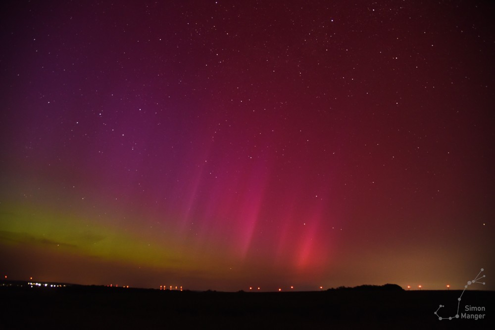 Am Donnerstag, den 9. Mai 2024, entdeckte ich zufällig auf Webseite von Andreas Möller (www.polarlicht-vorhersage.de) eine konkrete Polarlichtwarnung für die darauf folgenden Nächte. Zu dieser Zeit war die Sonne besonders aktiv und es gab dementsprechend meherere Flares und koronale Masseauswürfe auf der Sonnenoberfläche, welche Materie der Sonne in Richtung Erde schleuderten. Da die Vorhersage recht konkret war, hatte ich vorsorglich über WhatsApp die möglicherweise anstehenden Polarlichter angekündigt. Um vorbereitet zu sein, lud ich meine Kamera samt Stativ in mein Auto, um bei Bedarf möglichts zügig in die Flur hinauszufahren. Im gleichen Zeitraum fand das Internationalen Teleskoptreffen Vogelsberg (ITV) bei Gedern statt, welches ich am darauf folgenden Tag besuchte . Auf dem ITV ergaben sich viele Möglichkeiten, die Sonne im Weißlicht und in Hα zu beobachten. Es gab eine sehr ausgedehnte Sonnenfleckengruppe zu sehen, welche aus dutzenden von Einzelflecken bestand, welche wiederum in einer allumfassenden Penumbra eingebettet waren. Abseits davon waren auch noch einige kleinere Sonnenflecken zu sehen. Zudem gab es eine außerordentlich große Protuberanz zu sehen. Stündlich schaute ich im Internet nach, ob es hinsichtlich der Polarlicht-Vorwarnung Neuigkeiten gab. Für den Fall der Fälle hätte ich auf dem Weg nach hause einen Zwischenstopp eingelegt, um die Polarlichter zu fotografieren. In der darauf folgenden Nacht blieb es jedoch ruhig.