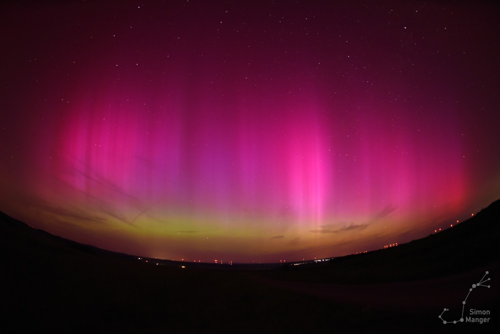 Am Donnerstag, den 9. Mai 2024, entdeckte ich zufällig auf Webseite von Andreas Möller (www.polarlicht-vorhersage.de) eine konkrete Polarlichtwarnung für die darauf folgenden Nächte. Zu dieser Zeit war die Sonne besonders aktiv und es gab dementsprechend meherere Flares und koronale Masseauswürfe auf der Sonnenoberfläche, welche Materie der Sonne in Richtung Erde schleuderten. Da die Vorhersage recht konkret war, hatte ich vorsorglich über WhatsApp die möglicherweise anstehenden Polarlichter angekündigt. Um vorbereitet zu sein, lud ich meine Kamera samt Stativ in mein Auto, um bei Bedarf möglichts zügig in die Flur hinauszufahren. Im gleichen Zeitraum fand das Internationalen Teleskoptreffen Vogelsberg (ITV) bei Gedern statt, welches ich am darauf folgenden Tag besuchte . Auf dem ITV ergaben sich viele Möglichkeiten, die Sonne im Weißlicht und in Hα zu beobachten. Es gab eine sehr ausgedehnte Sonnenfleckengruppe zu sehen, welche aus dutzenden von Einzelflecken bestand, welche wiederum in einer allumfassenden Penumbra eingebettet waren. Abseits davon waren auch noch einige kleinere Sonnenflecken zu sehen. Zudem gab es eine außerordentlich große Protuberanz zu sehen. Stündlich schaute ich im Internet nach, ob es hinsichtlich der Polarlicht-Vorwarnung Neuigkeiten gab. Für den Fall der Fälle hätte ich auf dem Weg nach hause einen Zwischenstopp eingelegt, um die Polarlichter zu fotografieren. In der darauf folgenden Nacht blieb es jedoch ruhig.