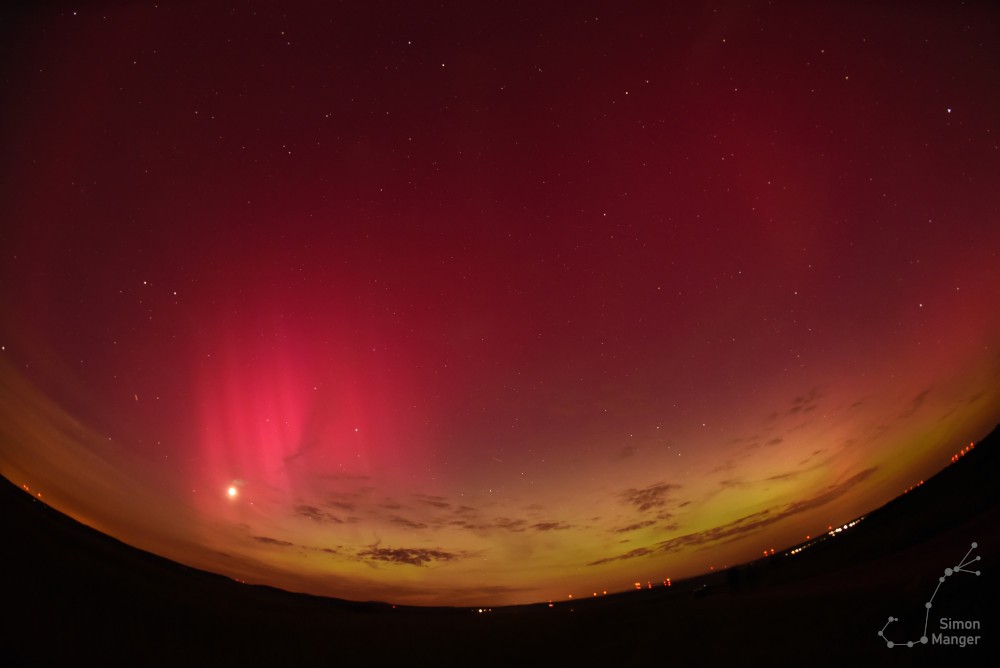 Am Donnerstag, den 9. Mai 2024, entdeckte ich zufällig auf Webseite von Andreas Möller (www.polarlicht-vorhersage.de) eine konkrete Polarlichtwarnung für die darauf folgenden Nächte. Zu dieser Zeit war die Sonne besonders aktiv und es gab dementsprechend meherere Flares und koronale Masseauswürfe auf der Sonnenoberfläche, welche Materie der Sonne in Richtung Erde schleuderten. Da die Vorhersage recht konkret war, hatte ich vorsorglich über WhatsApp die möglicherweise anstehenden Polarlichter angekündigt. Um vorbereitet zu sein, lud ich meine Kamera samt Stativ in mein Auto, um bei Bedarf möglichts zügig in die Flur hinauszufahren. Im gleichen Zeitraum fand das Internationalen Teleskoptreffen Vogelsberg (ITV) bei Gedern statt, welches ich am darauf folgenden Tag besuchte . Auf dem ITV ergaben sich viele Möglichkeiten, die Sonne im Weißlicht und in Hα zu beobachten. Es gab eine sehr ausgedehnte Sonnenfleckengruppe zu sehen, welche aus dutzenden von Einzelflecken bestand, welche wiederum in einer allumfassenden Penumbra eingebettet waren. Abseits davon waren auch noch einige kleinere Sonnenflecken zu sehen. Zudem gab es eine außerordentlich große Protuberanz zu sehen. Stündlich schaute ich im Internet nach, ob es hinsichtlich der Polarlicht-Vorwarnung Neuigkeiten gab. Für den Fall der Fälle hätte ich auf dem Weg nach hause einen Zwischenstopp eingelegt, um die Polarlichter zu fotografieren. In der darauf folgenden Nacht blieb es jedoch ruhig.