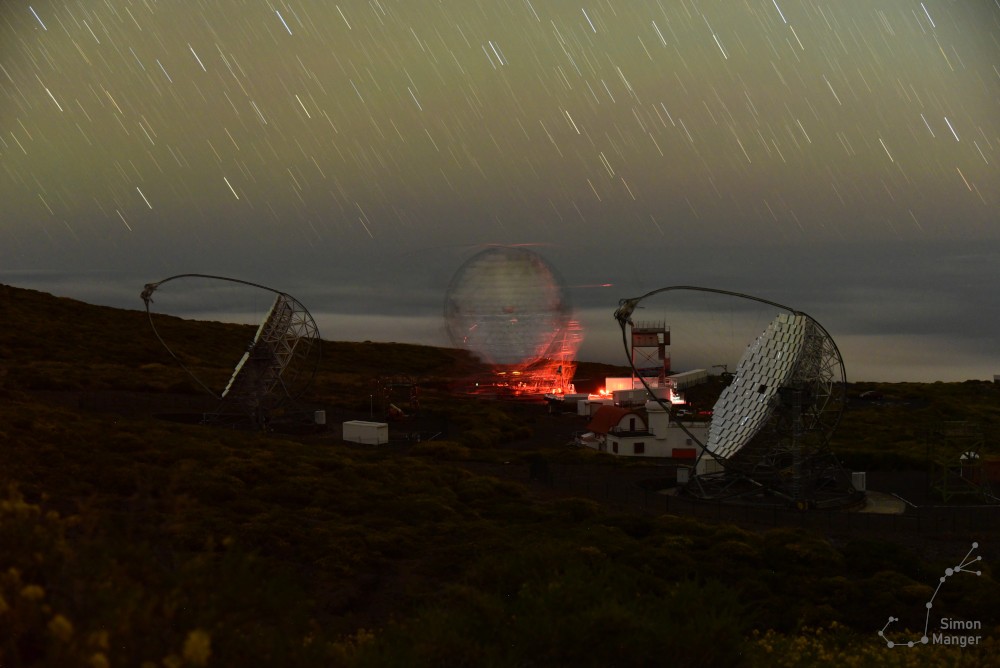 Wie schon geschrieben, hatte ich bei Kai von Schauroth bzw. Athos wieder einen 16“ Dobson-Teleskop gemietet. Nach einer kurzen Einweisung wurde das Teleskop mit dem Mietwagen über vielen Serpentinen hinauf zu den Observatorien transportiert. Zum Glück konnte ich das Teleskop in zusammengebautem Stand samt Zubehör in den temperierten Container von FACT stellen, sodass mir das tägliche Zerlegen und Zusammenbauen des Dobsons erspart geblieben ist. Da ich direkt vor dem Kontrollgebäude , umgeben von gelb blühendem Drüsenginster und riesigen Cherenkov-Teleskopen, beobachten durfte, musste ich meine Ausrüstung nur 30 Meter weit tragen. Im Countinghouse selbst waren Tee, Kuchen und Gesellschaft zu finden. Nach einer kurzen Überprüfung der Justage hatte das Teleskop nun ausreichend Zeit um sich an die Umgebungstemperatur anzupassen. Durch die komfortable Vorbereitung blieb genügend Zeit, um die Dämmerung mit dem damit einhergehenden Farbspiel zu beobachten. Auch das Vorbeiziehen der Passatwolken war ein Schauspiel für sich, zumal ich sich dieses von oben herab beobachten ließen. Nachdem zum Sonnenuntergang die Touristen verschwunden waren, kam mehr und mehr Bewegung in und um die Observatorien zum Vorschein. Überall begannen sich Kuppeln zu öffnen und das ein oder andere Teleskop lugte heraus.