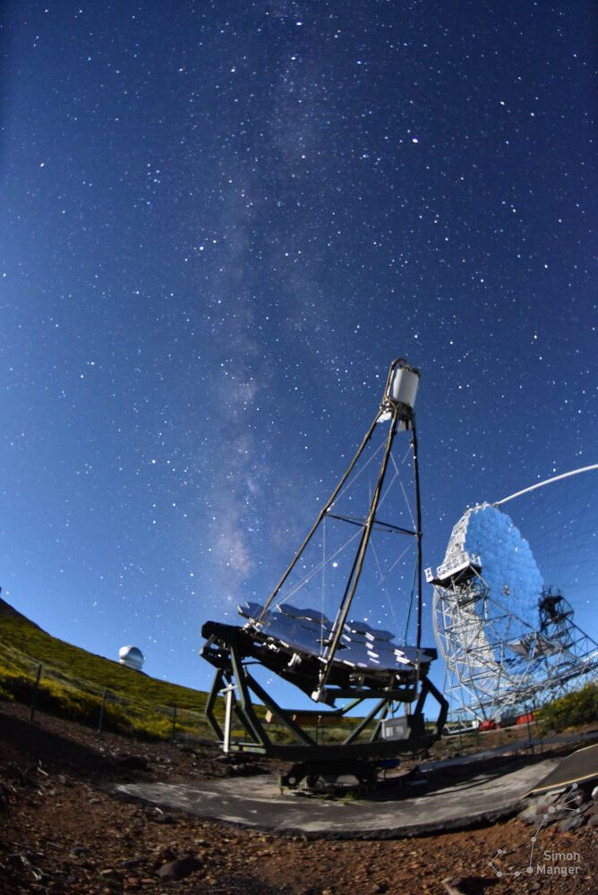 Wenige Tage später begann für meine Reisebegleiterin die Arbeit bei den MAGIC-Teleskopen. Hierfür bekamen wir gleich zu Anfang eine Sicherheitsunterweisung samt Helm und Lampe. Da sich die Schichten überlappten, waren wir zeitweise zu acht, wobei sich diese internationale Truppe überwiegend aus Doktoranden und Postdoktoranden zusammensetzte. Zu Beginn dieser Zeit ergab sich für uns auch eine Führung am Lage-Sized-Telescope-1 (LST-1), welches sich zum damaligen Zeitpunkt im Probebetrieb befand.