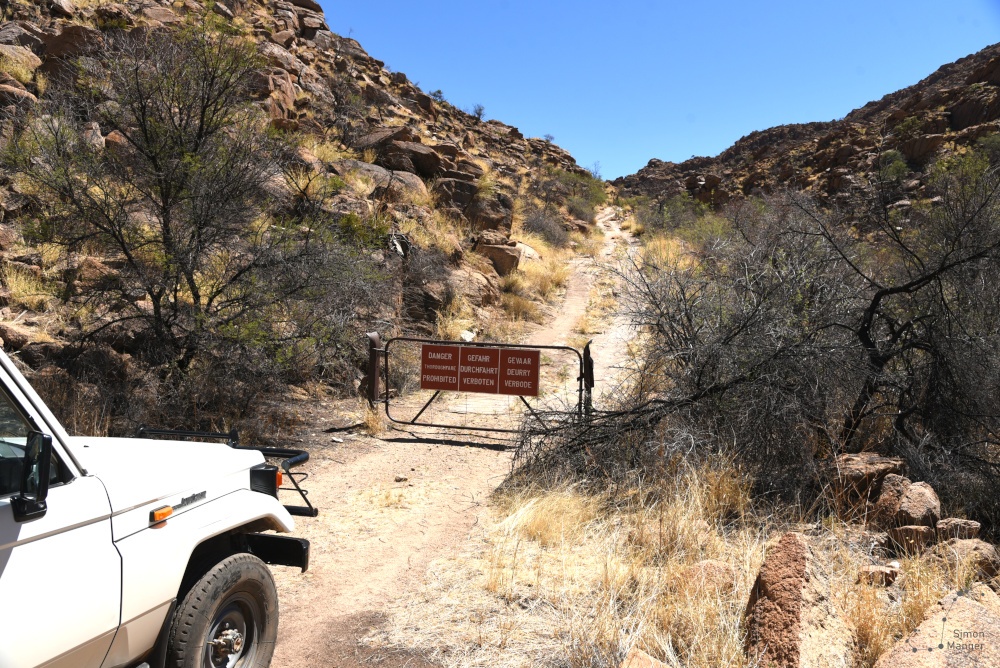 Im weiteren Verlauf der Fahrt ging es an Viehgattern, diversen Autowracks und durch trockene Bachbetten zur Auffahrt des Gamsberges. Die uns erwartende Auffahrt war respekteinflößend. Jenseits des Tores geht es in teils sehr steilen Passagen den Berg hinauf, wobei lediglich die Fahrspuren selbst mit Beton befestigt sind. Im Schneckentempo meistere Friedhelm Hund die viele Spitzkehren und brachte uns stets am Abgrund entlang sicher auf das Plateau des großen Gamsberges. Wer nicht schwindelfrei war, kniff während der Fahrt die Augen zu.