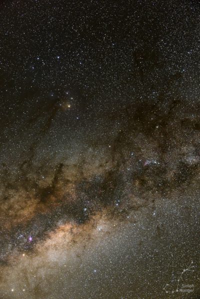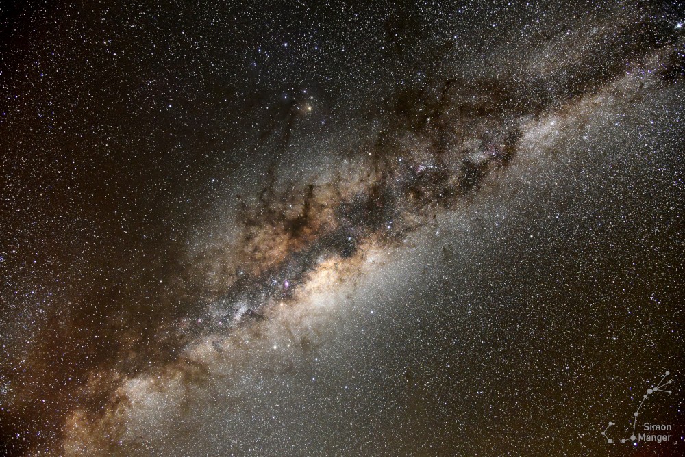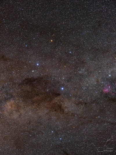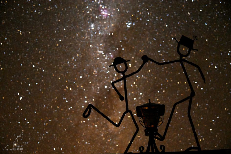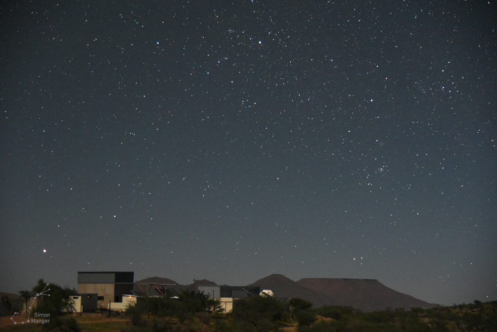 Wie so oft bei meinen Beobachten, nahm ich mir auch auf der Astrofarm Hakos die Zeit, um mich mit dem bloßen Augen bzw. ohne technische Mittel dem Sternenhimmel zu widmen. Durch die südliche Lage, waren Sternbilder zu sehen, die mir von Europa aus verwehrt bleiben. Zu Beginn der Nacht ließen sich die Magellanschen Wolken beobachten, die dezent leuchtend über dem Südhorizont standen. Ab der zweiten Nachthälfte wiederum, stieg das Zentrum der Milchstraße hoch den Himmel hinauf und ließ mich in dessen Licht die nähere Umgebung schemenhaft erkennen. Mit der Sternkarte in der Hand, gelang nach und nach die Orientierung am Südsternhimmel. Neben Sternbildern aus der Antike, waren auch Sternbilder aus der Neuzeit anzutreffen. So gab es neben dem Sternbild Zentaur auch das Sternbild Chemischen Ofen und Luftpumpe zu sehen.