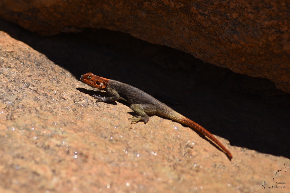 Nach so viel Aufregung gab es im Schatten einer Pergola erst mal einen kurzen Lunch, den uns die Chefin der Farm zusammenstellen hat lassen. Meine Mitreisenden interessierten sich brennend für die dortige Geologie, sodass sie gefühlt jeden zweiten Stein umdrehten, wohl auch in der Hoffnung, das ein oder andere Tierchen zu entdecken. Vom Rand des Plateaus aus hat man eine grandiose Fernsicht. Aufgrund des klaren Himmels ließ sich sogar der Rand der über 100 km entfernt liegenden Namibwüste erkennen.