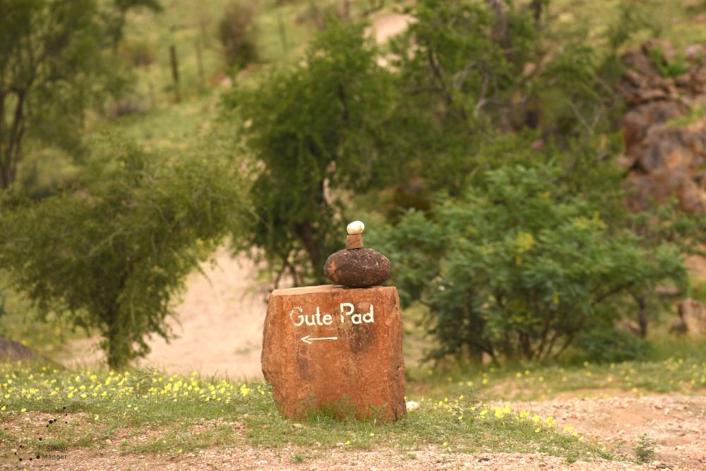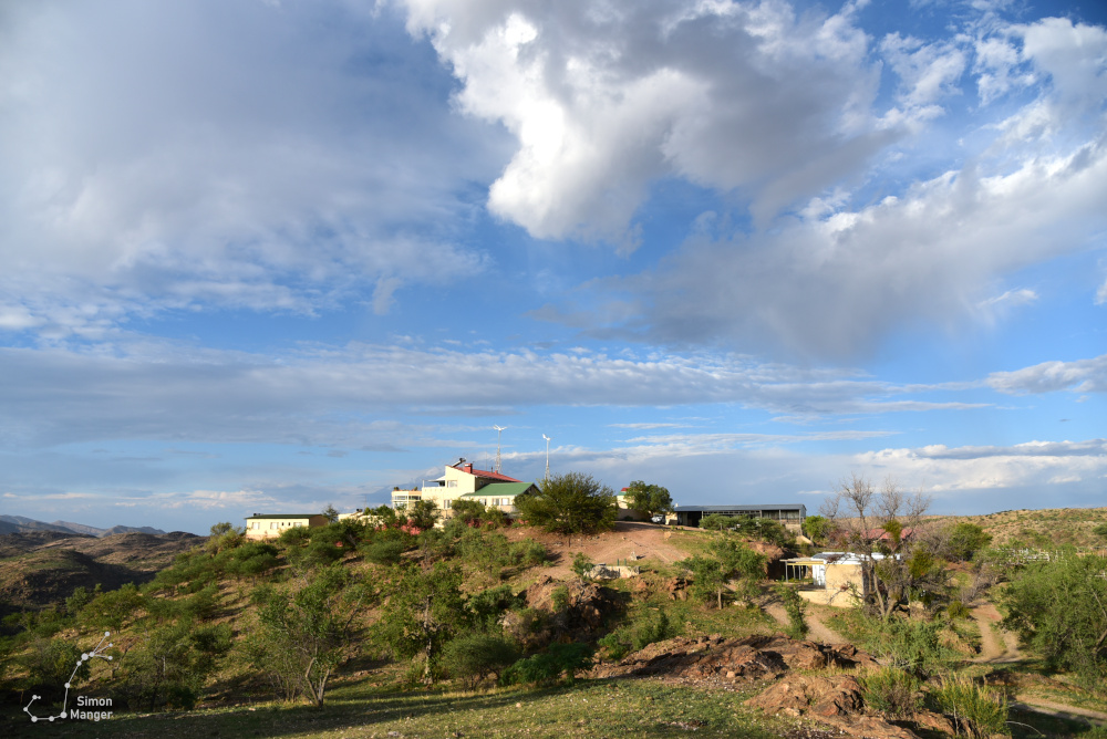 Während der Fahrt gab es einiges zusehen. Schon von Weitem zeigten sich der große und der kleine Gamsberg. Ersterem sollte ich im weiteren Verlauf meines Aufenthaltes noch einen Besuch abstatten. Von der Straße aus ließ sich zudem ein Blick auf die HESS-Teleskope werfen, bei denen es sich um ein System aus fünf offen gebauten Tscherenkow-Teleskopen handelt. Diese beobachten am Nachthimmel verschiedene Gammastrahlen-Quellen, wobei diese genau genommen die in der Atmosphäre entstehenden Tscherenkow-Strahlung detektieren. Nachdem das Tor zur Farm erreicht war, ging es über eine schmale Pad direkt zum Gästehaus.