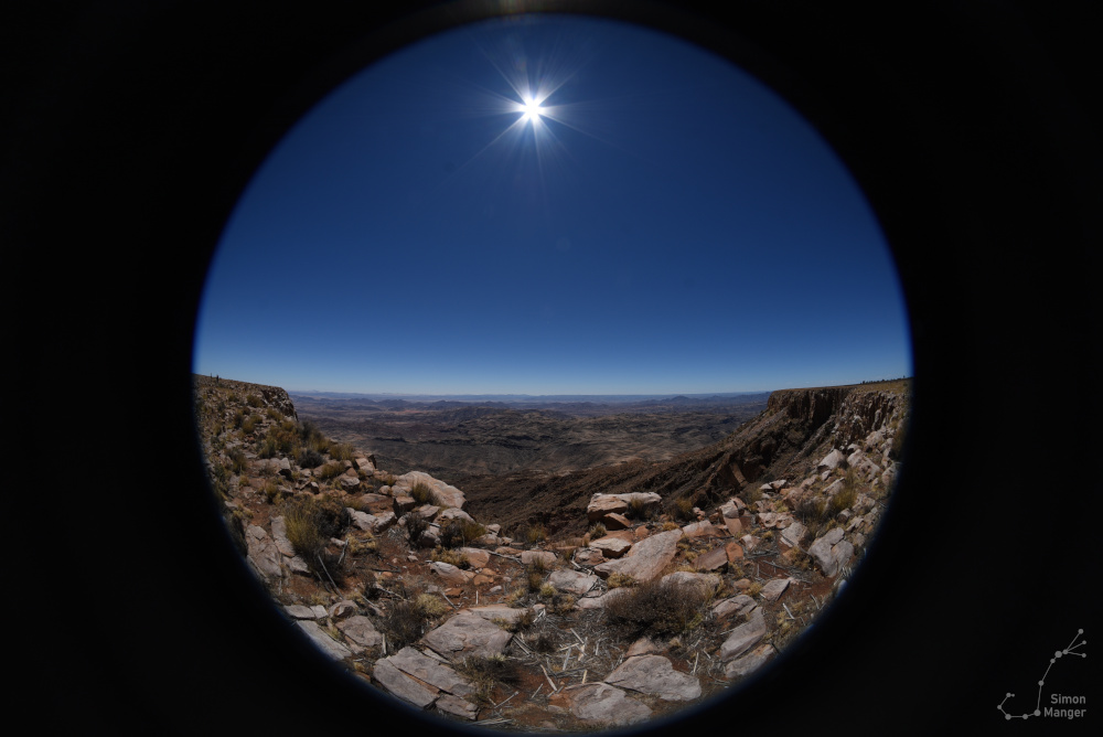 Tagsüber erkundete ich zusammen mit dem Hund die nähere Umgebung. Ausgefahrene Wege führen hinab in die Schlucht bzw. über die Hochebene. Teilweise ging es auch quer durch die Botanik, wobei mir der Hund nicht von der Seite wich und nach allerhand Getier, vor allem Giftigem, Ausschau hielt. Die dortige Landschaft erscheint im ersten Moment karg und monoton, was allerdings täuscht. Was Geologie, Flora und Fauna betrifft, ist dieser Flecken Erde dennoch reich gesegnet. Neben den Astronomen zieht es auch den ein oder anderen Geologen und Biologen in diese Gegend. Die stark zerklüftete Landschaft gehört geologisch betrachtet zur Großen Randstufe und somit zu den ältesten geologischen Formationen auf diesem Planeten. Die Landschaft zeichnet sich durch geschieferten Granit aus, der vielerorts durch dicke Quarzadern durchzogen ist.