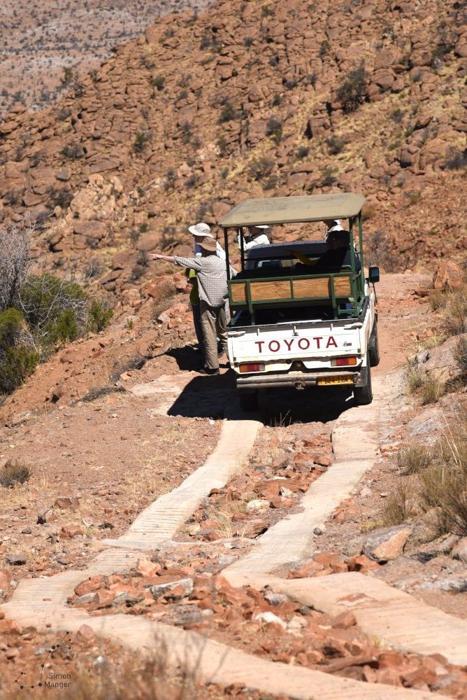 Die Fahrt zum Gamsberg gestaltete sich abenteuerlich. Auf einem Pickup, dessen Ladefläche mit drei Sitzbänke versehen war, fuhren wir los, den Gamsberg immer im Blick. Um überhaupt an den Fuß des Berges zu gelangen, mussten wir über das Gelände der Nachbarfarmen fahren, was einer vorherigen Anmeldung bedurfte. Die Anmeldung war nicht nur deshalb erforderlich, weil es sich um ein fremdes Grundstück handelte, vielmehr ging es auch darum, dass die bewaffneten Wildhüter über unser Kommen Bescheid wusste. Diese habe die Aufgabe, die Nashörner und insbesondere die Wilderer im Blick zu behalten. Die Wilderei ist in Namiba nach wie vor ein großes Problem.