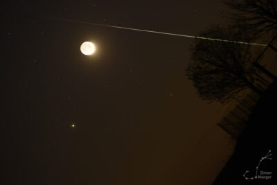 Eine helle Stenrschnuppe gesellt sich zu Mond, Jupiter und dem Kometen 12P Pons-Brooks