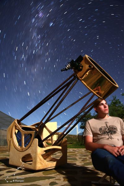 Mein Name ist Simon Manger. Seit ich mich erinnern kann, gilt meine Faszination dem Mond, den Sternen und der Nacht als solchen. Sobald die Sonne untergegangen ist und der gestirnte Himmel durch die Wolken freigegeben wird, zieht es mich hinaus – aus dem Haus, in die Flur, an Orte mit möglichst ungetrübter Sicht in den Himmel. Mit dem bloßen Auge, wie auch mit dem Teleskop, beginne ich dann die großen und kleinen Wunder des Nachthimmels aufzusuchen. Mal allein, mal zusammen mit Freunden.